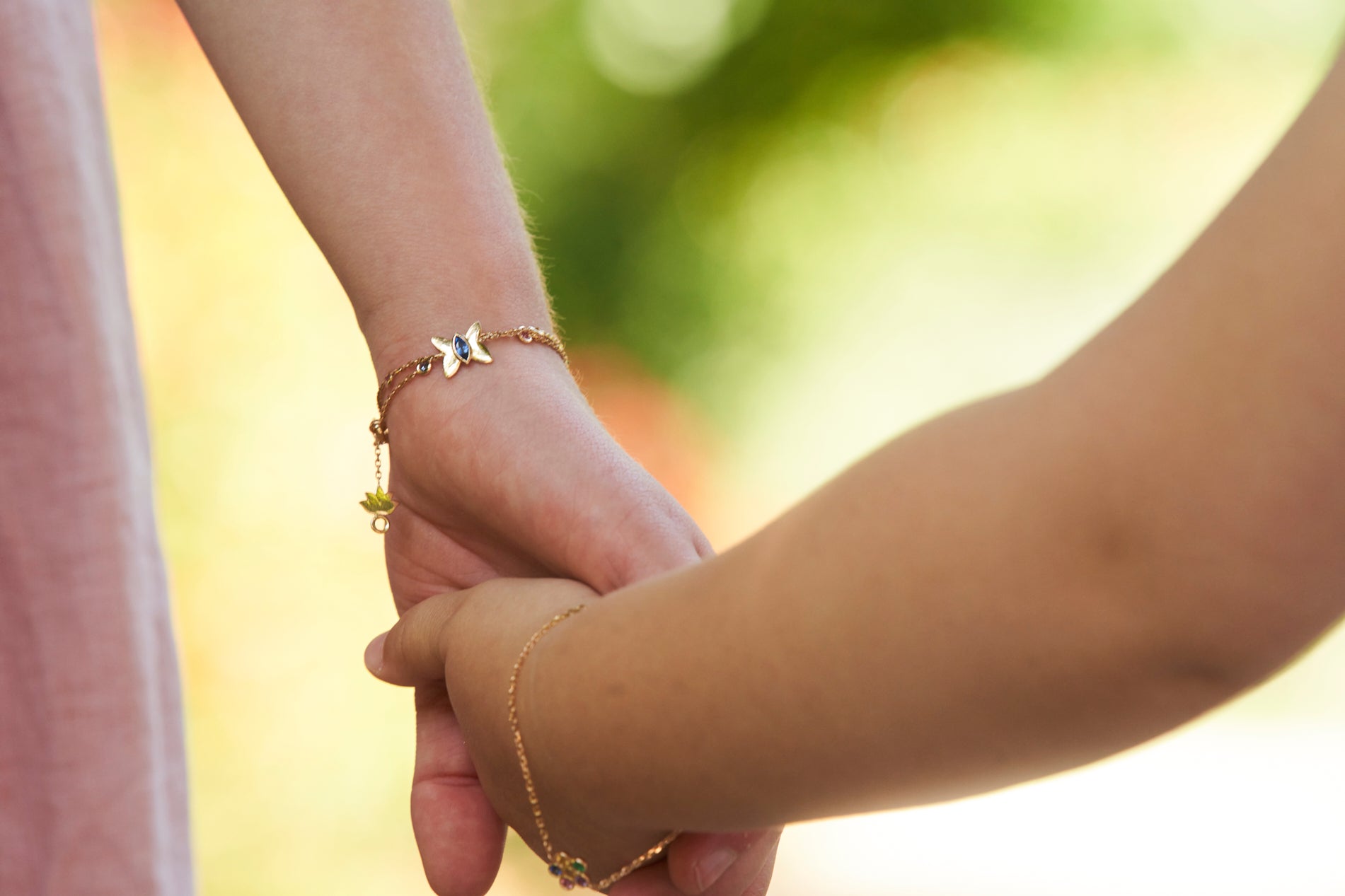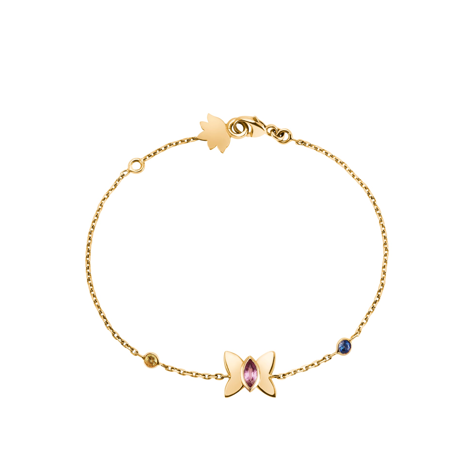 Bracelet en or rose 18 carats avec motif papillon en or rose,1 saphir navette rose 5x2,5 mm, 1 saphir Ceylan rond 2,1 mm, et 1 saphir jaune rond 2,1 mm.
