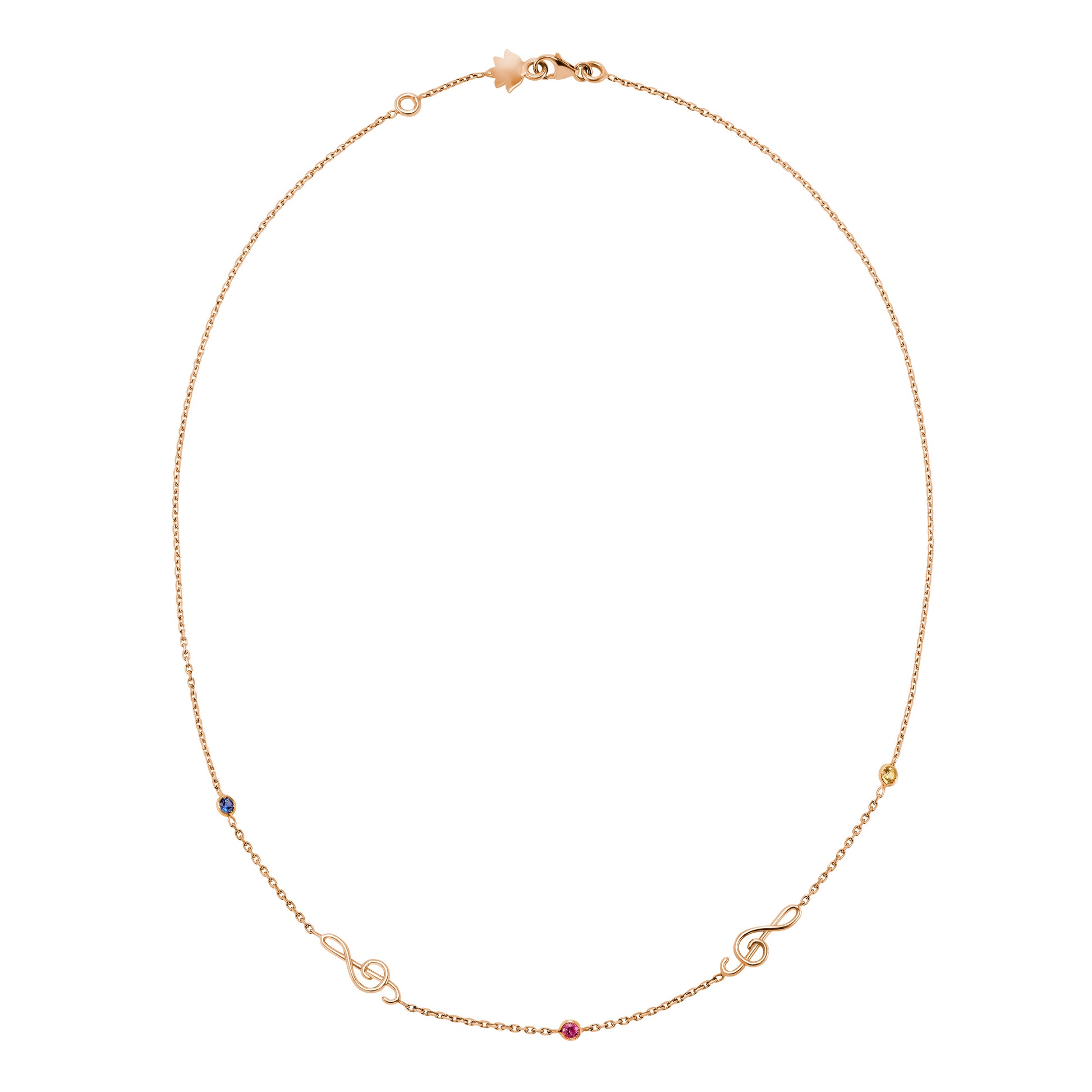 Collier en or rose 18 carats avec 1 saphir Ceylan rond 2,3mm, 1 saphir jaune rond 2,3mm et 1 saphir rose rond 2,3mm. Motifs clef de sol en or rose.